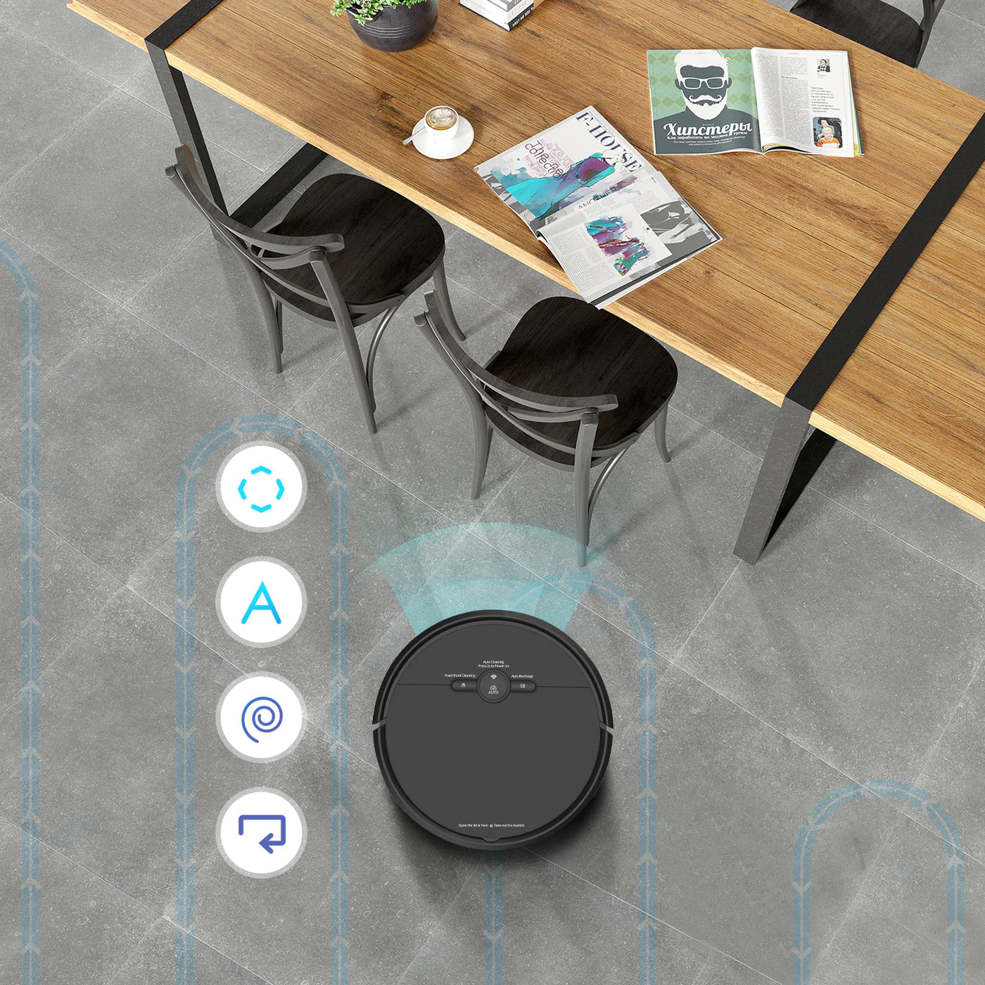 În timpul fiecărei curățări, se deplaseaza complet sistematic și logic. Datorită senzorilor de maximă precizie, știe exact unde să meargă și ce loc să evite. robotul se reîncarcă și reia de acolo de unde a rămas, asigurând o curățare completă și eficientă.